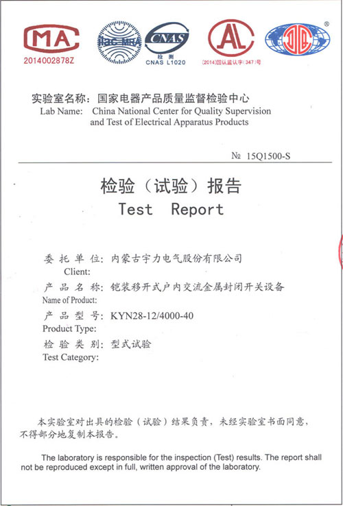 KYN28-12/4000-40中置式開(kāi)關(guān)柜(檢驗(yàn)報(bào)告)