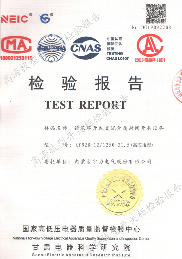 KYN28-12/1250-31.5高海拔型中置式開(kāi)關(guān)柜(試驗(yàn)報(bào)告)