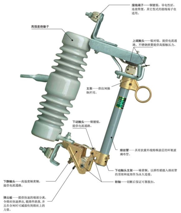 RW7跌落式熔斷器及拉負(fù)荷跌落式熔斷器是戶外高壓保護(hù)電器。它裝置在配電變壓器高壓側(cè)或配電線支干線路上、用作變壓器和線路的短路、過載保護(hù)及分、合負(fù)荷電流。跌落式熔斷器由絕緣支架和熔絲管二部分組成,靜觸頭安裝在絕緣支架兩端,動觸頭安裝在熔絲管兩端,熔絲管由內(nèi)層的消弧管和外層的酚醛紙管或環(huán)氧玻璃布管組成。拉負(fù)荷跌落式熔斷器增強(qiáng)彈性輔助觸頭及滅弧罩,用以分,合負(fù)荷電流。