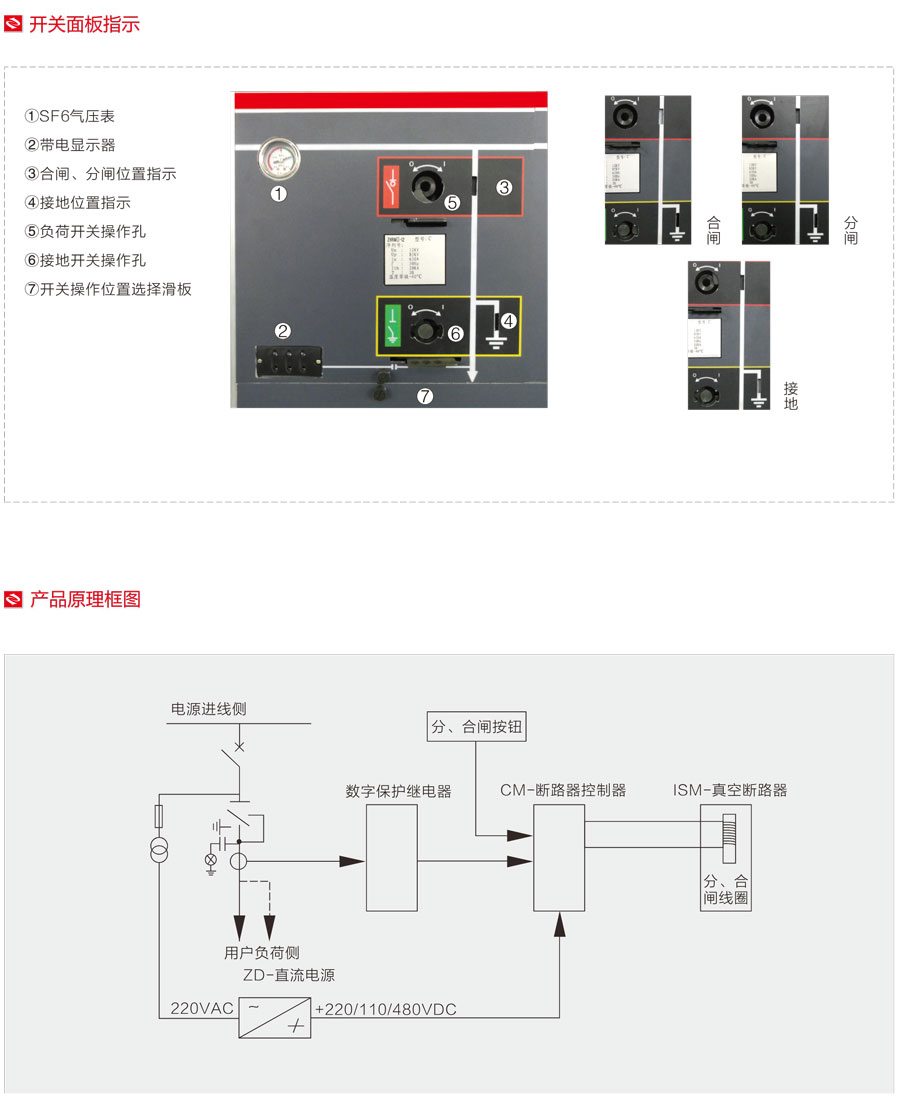 負(fù)荷開關(guān)采用同軸旋轉(zhuǎn)雙斷點(diǎn)方式,通過同一操作孔與滑板配合進(jìn)行動(dòng)能操作,因此開關(guān)在任一時(shí)刻只能處于“合閘、分閘、接 地”三種狀態(tài)的其中之一,徹底避免誤操作。